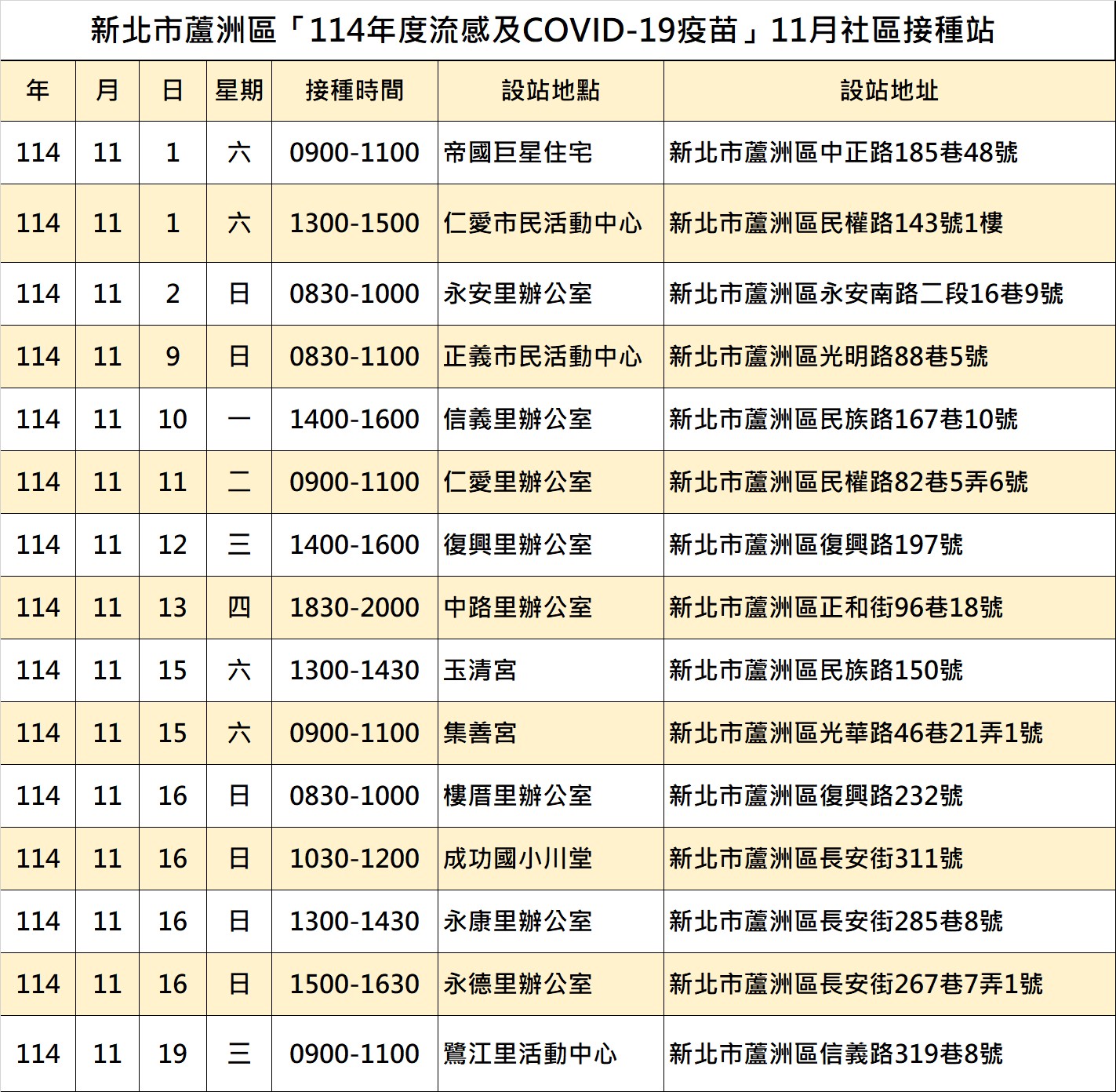 三、蘆洲區衛生所流感及新冠疫苗施打時間